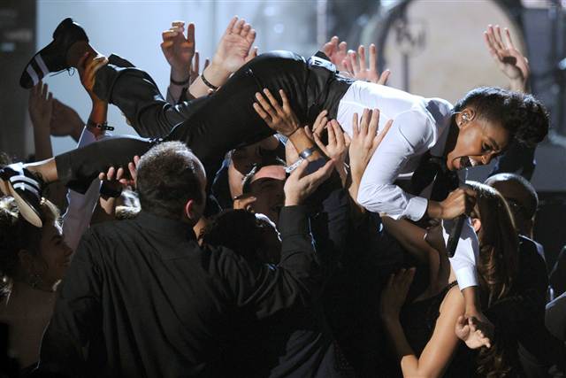 The other performers on the night, which ranged from Muse to Lady Antebellum to Bob Dylan with Mumford and Sons to Mick Jagger. Though it was a genuinely nice surprise to see Justin Beiber sing live throughout a whole performance of Never say Never alongside Usher, the female singers were in charge of this year’s Grammys. Gwyneth Paltrow performed Forget You alongside a ridiculous looking Cee-Lo Green, her slinky Piano moves making the whole thing the most ‘fun’ performance of the night. Rihanna delivered a stellar double performance, first singing her version of Love The Way You Lie and then getting far to hot and sweaty with Drake in What’s My Name. Even on her weak nights, Rihanna always delivers the goods. The highlight of the night had to be the trio of young new artists consisting of B.O.B, Bruno Mars and Janelle Monae the last of which blew even GaGa out of the water with her crazed and electric performance of Cold War. Monae may have been snubbed in both her categories earlier in the night, but judging by her stage dive and the only true standing ovation of the night she has a lot more to come in the future.
